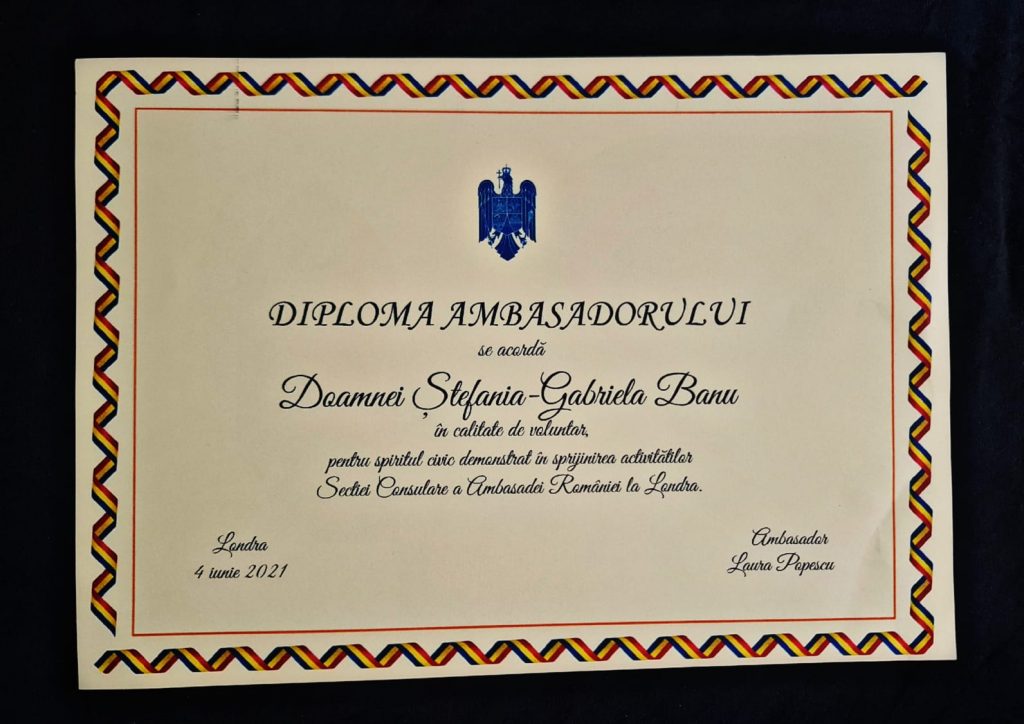 Awarded by His Excellency Dan Mihalache Ambasador of Romania in UK to all our volunteers for their hard work and support offered to the Romanians affected by the Covid-19 Pandemic